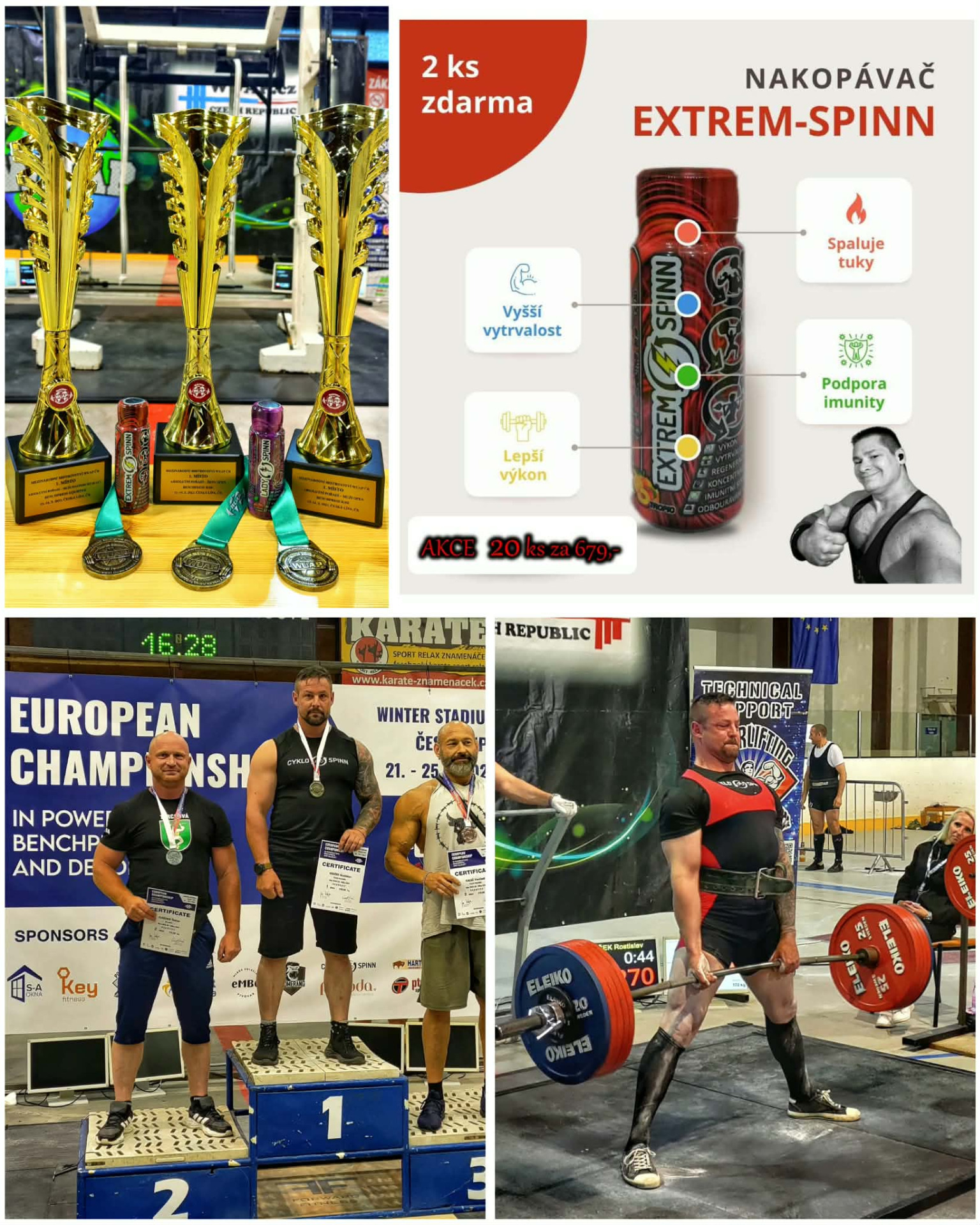 Ohromný úspěch pro naši značku Cyklo-spinn. V pátek 22.9 ve Vídni na MISTROVSTVÍ SVĚTA federace WUAP jsme získali mnoho cenných kovů a titulů. Všichni závodníci před kláním použili naše unikátní přípravky a to především nejsilnější variantu Extrem-spinn. V nabité konkurenci přes 500 závodníků z celého světa vybojovali - Marian Janovsky a Lukáš Jenšovský první místa ve svých kategoriích v bech-pressu. Tadeaš Souček a Darek Janovsky se stali vicemistry světa v bench-pressu ve svých kategoriích. V mrtvém tahu vybojoval stříbrnou medaili výkonem 290kg závodník Rostislav Boušek. Všem moc gratuluji a děkuji za úžasnou reprezentaci